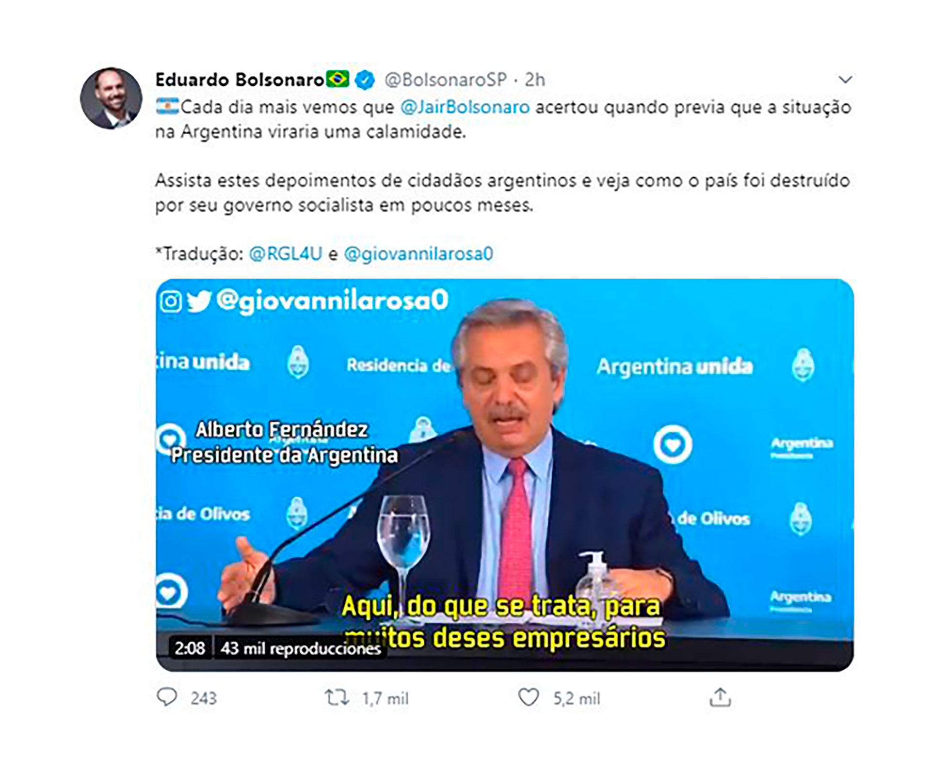 A las expresiones del mandatario de Brasil de este jueves se le suman las que lanzó un mes atrás su hijo, el diputado nacional Eduardo Bolsonaro quien publicó un mensaje en el que dijo que su padre “acertó cuando predijo que la situación en la Argentina se convertiría en una calamidad” a partir del aislamiento obligatorio por coronavirus.