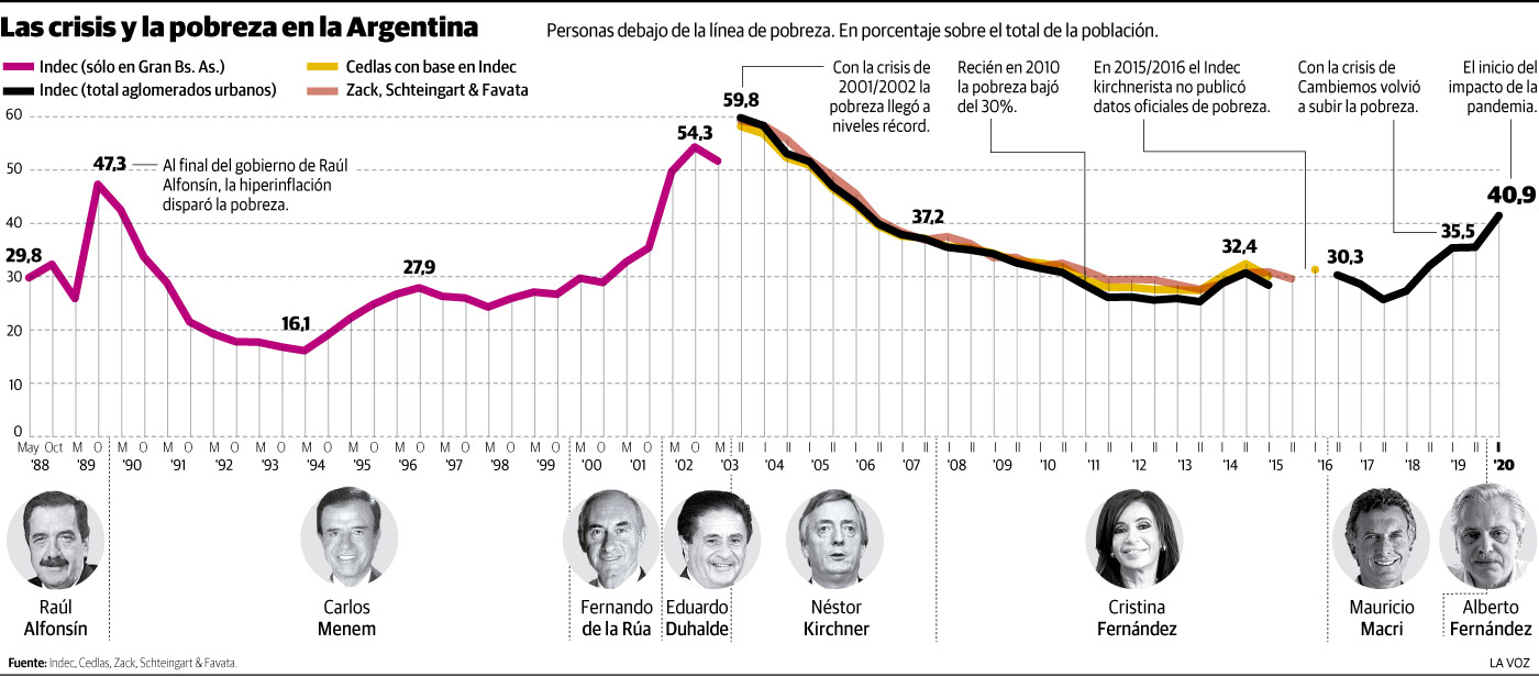 El índice de pobreza tuvo un incremento de 5,5 puntos porcentuales respecto de igual período de 2019, cuando se ubicó en el 35,4%, producto de la sostenida recesión en la economía. Entre ambas mediciones, la economía en su conjunto cayó 19,1%, la desocupación aumentó al 13,1%, del 10,6% anterior y la inflación al 42,8%, según cifras del Indec.