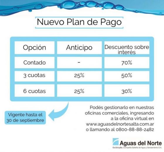 Hasta el 30 de septiembre se podrán cancelar las obligaciones vencidas con descuentos de hasta el 70% en los intereses y cuotas. Se puede tramitar a través de la oficina virtual de la empresa en www.aguasdelnortesalta.com.ar, llamando al 3874323216 de 8 a 13 o personalmente en las oficinas comerciales.