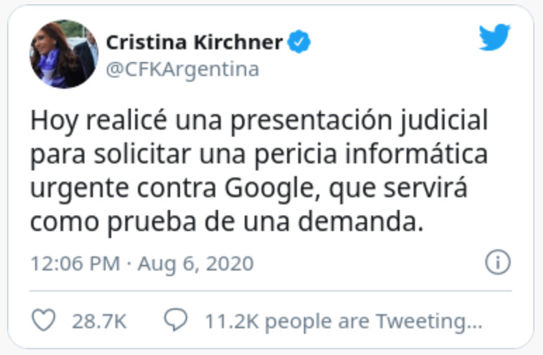 El gigante de internet salió a dar su versión sobre los hechos ocurridos en los últimos días. “Hemos tomado conocimiento de esta información a través de los medios, pero aún no hemos sido debidamente notificados”, respondió Google, según publicó La Nación, tras conocerse el tuit de Fernández de Kirchner, quien explicó: “Hoy realicé una presentación judicial para solicitar una pericia informática urgente contra Google, que servirá como prueba de una demanda”.