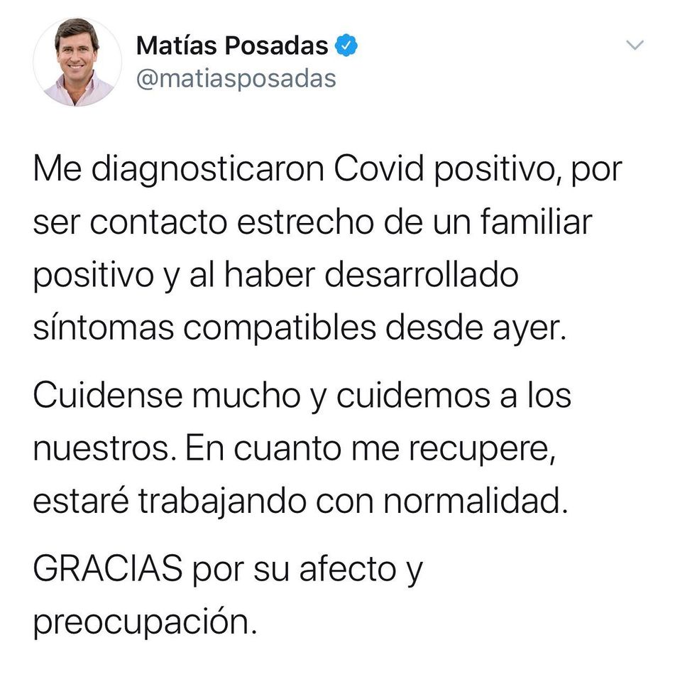 El Secretario de Gobierno, Matías Posadas hoy en la conferencia de prensa de la mañana no estuvo presente dado que se aisló preventivamentes desde el domingo, al comenzar a sentir los primeros sintomas , confirmó que contrajo la enfermedad, por contacto estrecho. Señalando además que desarrolló síntomas compatibles con la enfermedad.