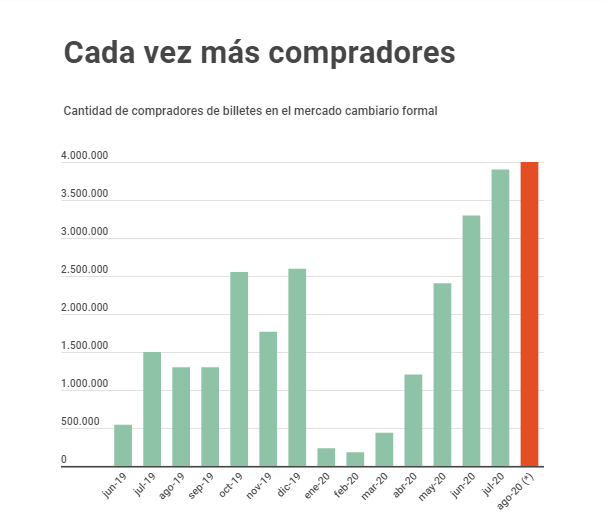 La compra de dólares desde junio 2019 hasta agosto 2020. (Fuente: Infobae).