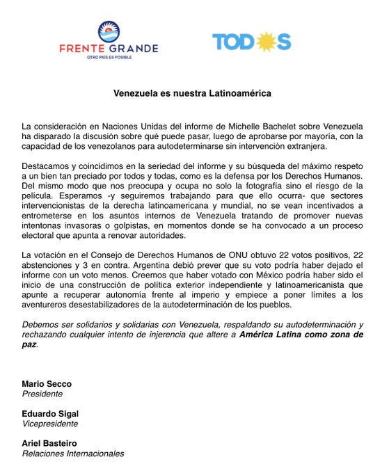 Secco y Sigal dijeron que la Argentina debe ser "solidaria" con Venezuela: "Respaldamos su autodeterminación y rechazando cualquier intento de injerencia que altere a América Latina como zona de paz". Desde Nuevo Encuentro, que conduce Martín Sabbatella, también salieron a repudiar la postura de la Cancillería.
