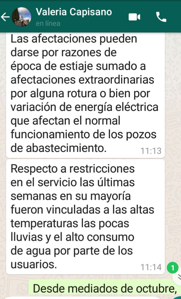 El problema se acrecienta en épocas de sequías, pero peor aún es la falta de respuesta cuando iniciamos el reclamo, notando una total falta de respeto a los vecinos de parte de los empleados que trabajan y atienden solo telefónicamente via 0800 .... o por wsph